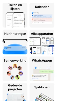 Beheer uw agenda en taken efficiënt met Any.do's geavanceerde kalenderfunctionaliteit. Of u nu een dag-, 3-dagen-, week- of agendaweergave prefereert, alles is beschikbaar, inclusief een handige kalenderwidget. Uw afspraken en taken worden naast elkaar gepresenteerd, voor een helder overzicht. Dankzij de naadloze synchronisatie blijven al uw lijsten, taken, herinneringen en notities perfect up-to-date op al uw apparaten, van uw telefoon tot uw Wear OS-gadget. Koppel eenvoudig uw telefoonkalender, Google Agenda, Facebook-evenementen of Outlook-kalender en mis nooit meer een belangrijke afspraak. Met de krachtige herinneringsopties – eenmalig, terugkerend, locatiegebaseerd of via spraak – en zelfs nieuwe WhatsApp-integratie, vergeet u nooit meer een taak. Werk bovendien moeiteloos samen: deel lijsten en wijs taken toe aan vrienden, familie of collega's om gezamenlijk doelen te bereiken.
